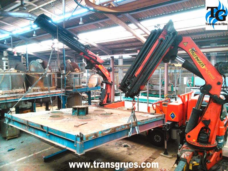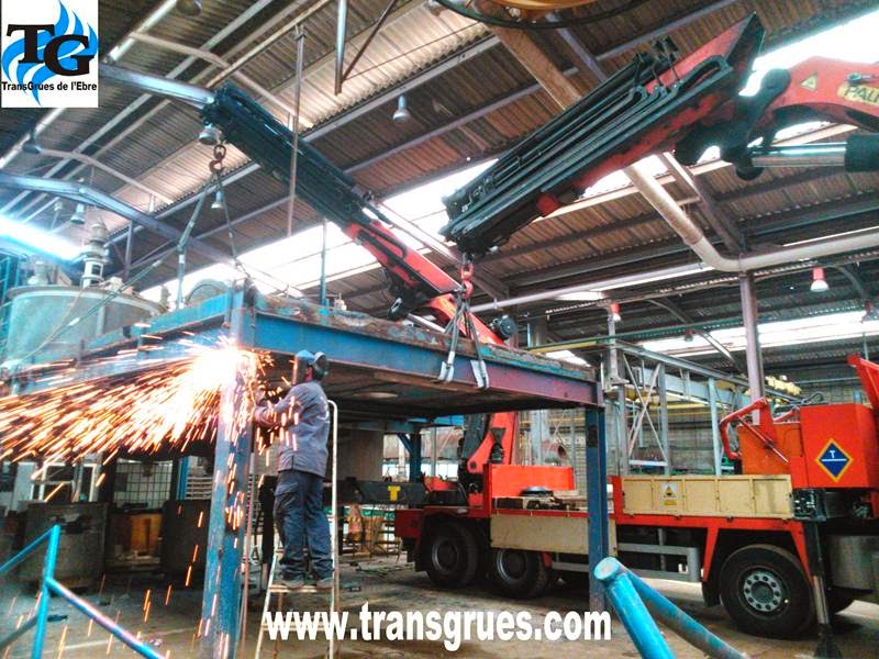 Desmontaje de un forjado mixto de acero/hormigón de 30 m2 y un peso aproximado de 20 Tm. con dos grúas articuladas colocadas en la parte trasera del camión. Este tipo de grúas consiguen la máxima maniobrabilidad en espacios cubiertos desplazando cargas importantes.